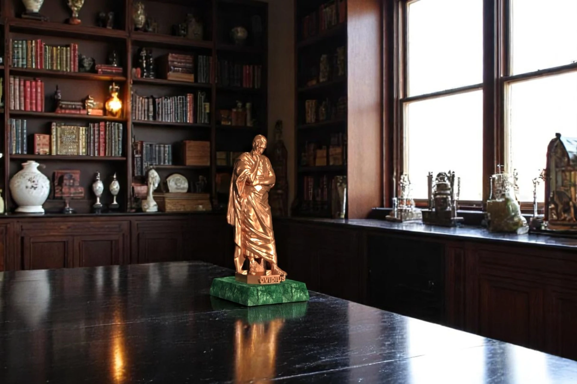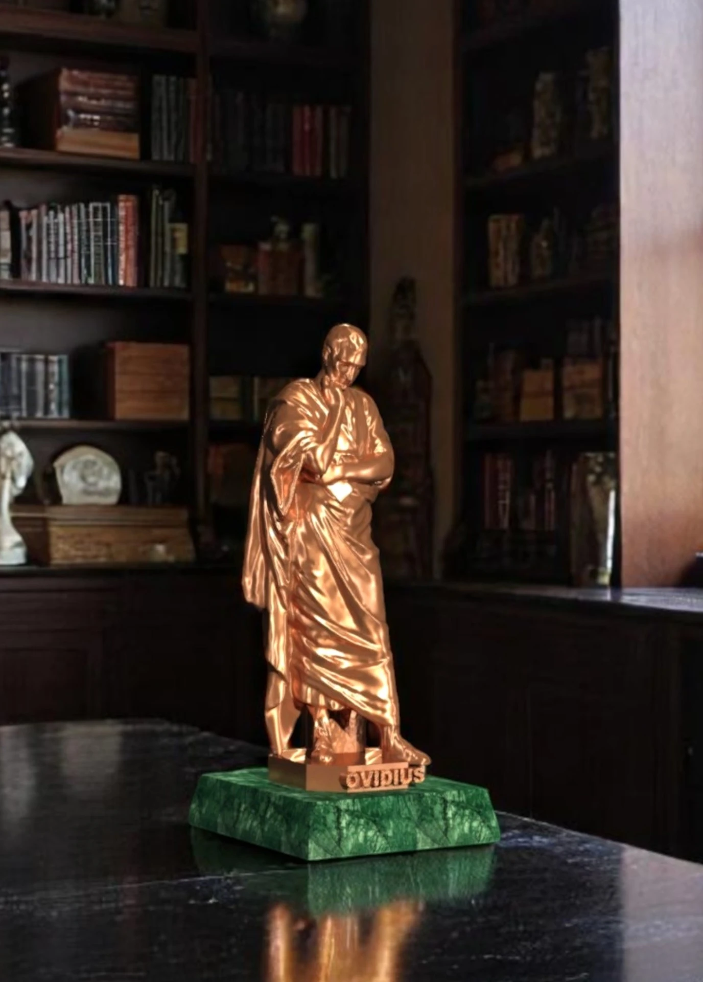 Statuetă Ovidius reconstruită după statuia poetului latin Ovidius din Constanța, amplasată pe suport de marmură Verde Guatemala.