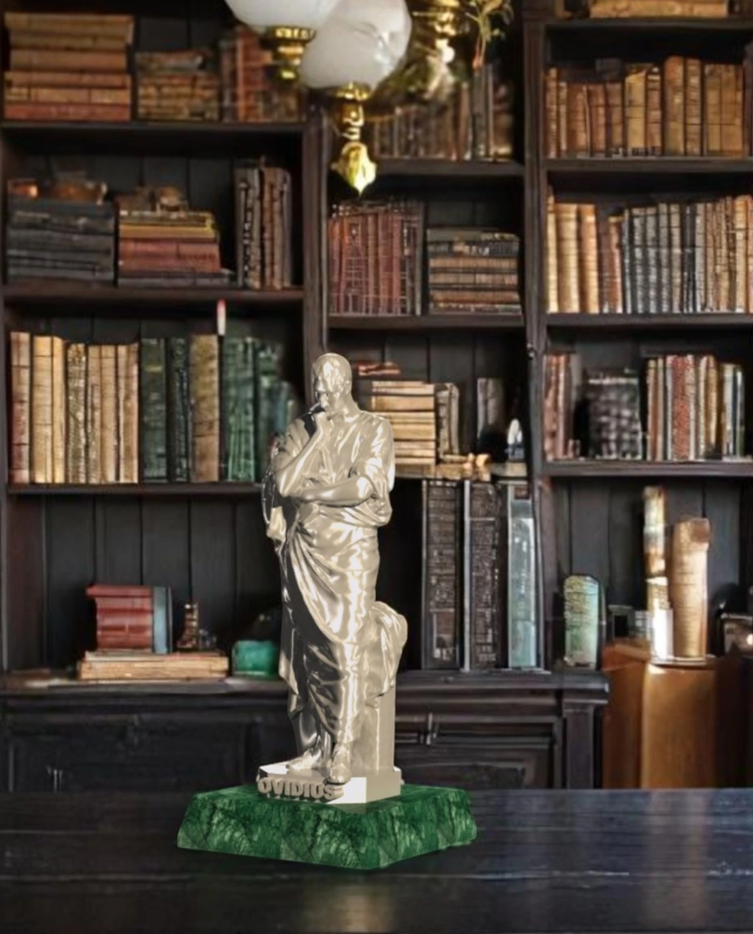 Operă a sculptorului italian Ettore Ferrari statuia din bronz care îl înfățișează pe poetul Ovidiu într-o postură meditativă a fost dezvăluită în august 1887.