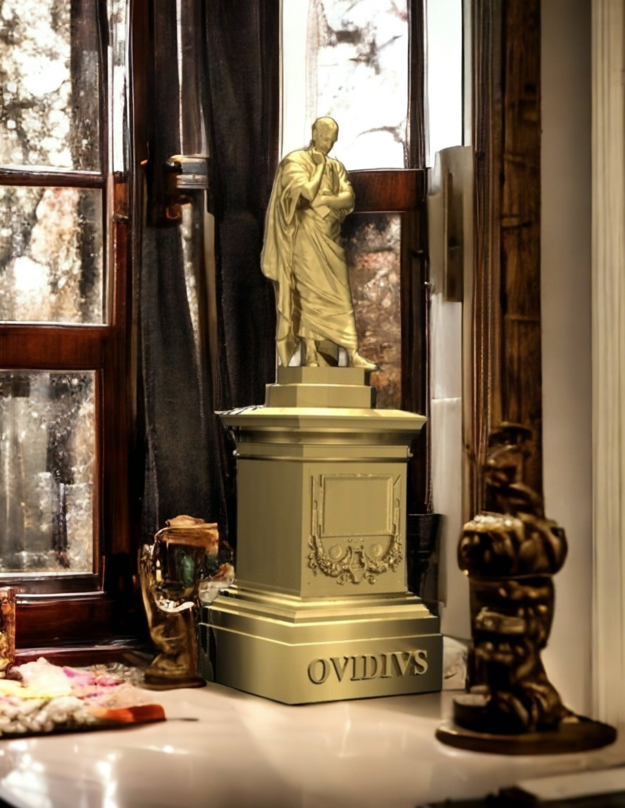Operă a sculptorului italian Ettore Ferrari statuia din bronz care îl înfățișează pe poetul Ovidiu într-o postură meditativă a fost dezvăluită în august 1887.