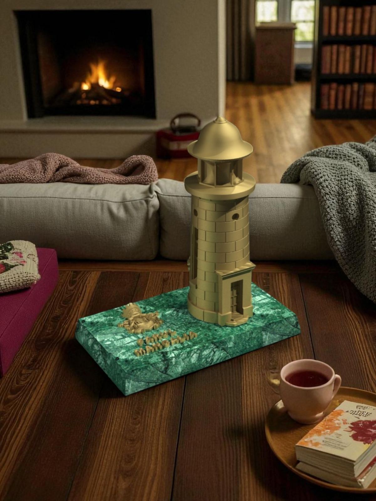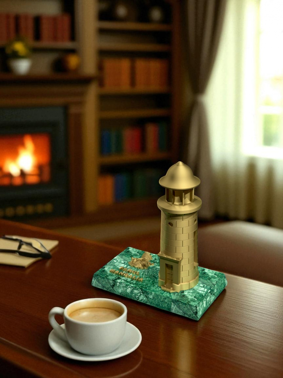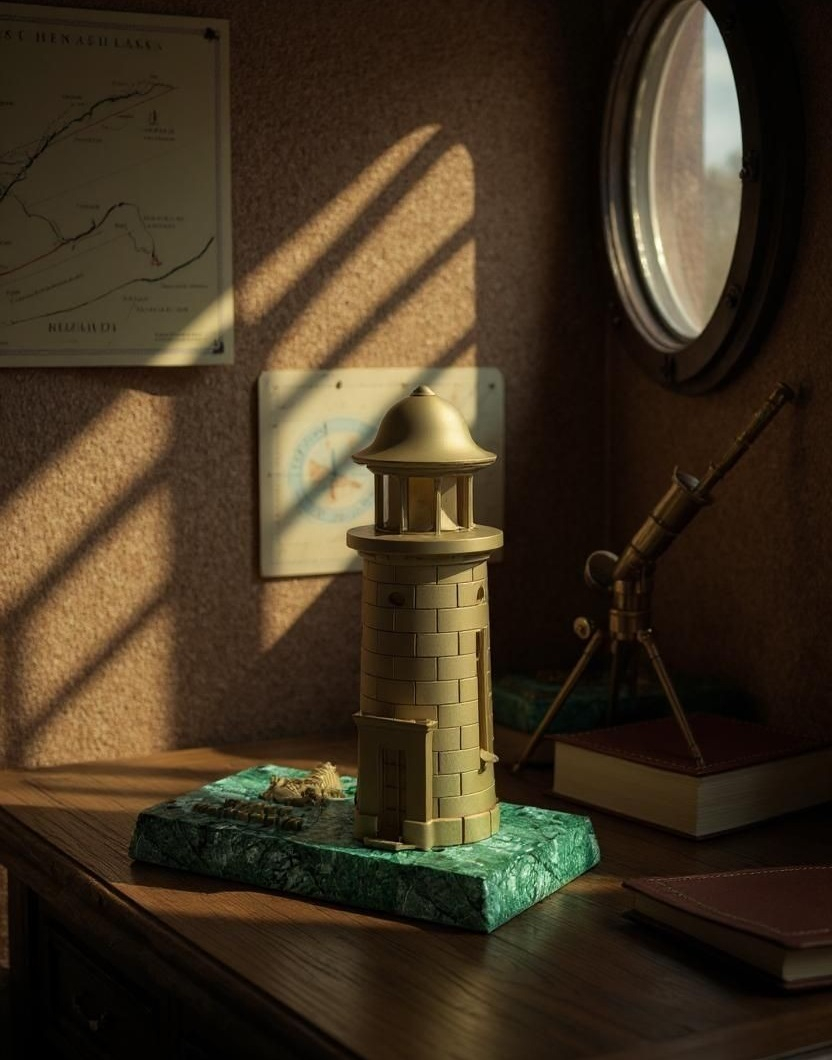 Statuetă Farul din Mangalia amplasată pe suport de marmură Verde Guatemala.